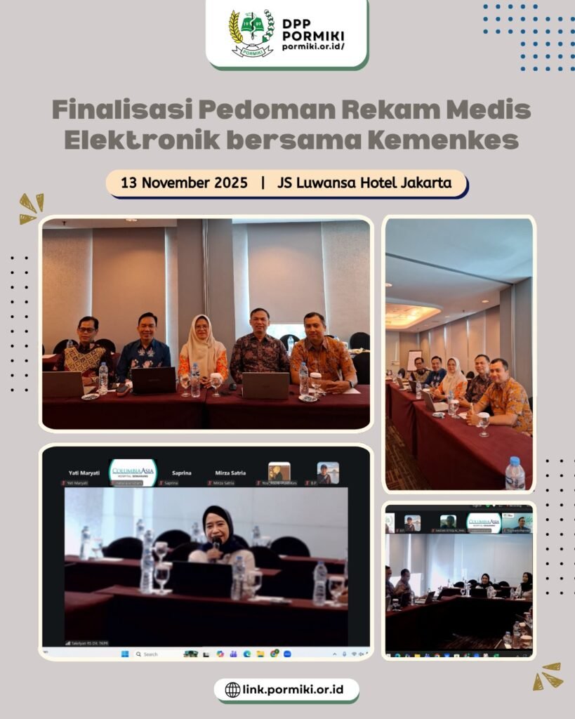 Perhimpunan Profesional Perekam Medis dan Informasi Kesehatan Indonesia (PORMIKI) telah melakukan pertemuan strategis finalisasi Pedoman Rekam Medis Elektronik (RME) bersama Kementerian Kesehatan dan para stakeholder terkait pada Kamis, 13 November 2025.